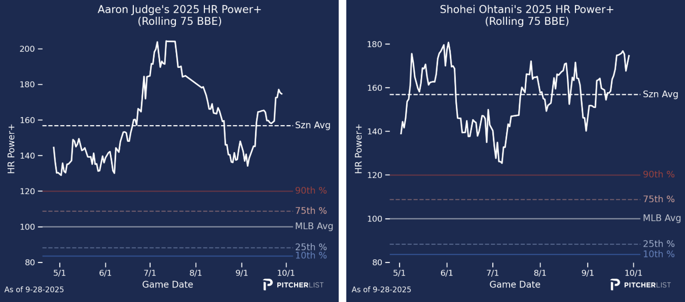 Aaron Judge, Shohei Ohtani, and Cal Raleigh lead the HR Power leaderboard.