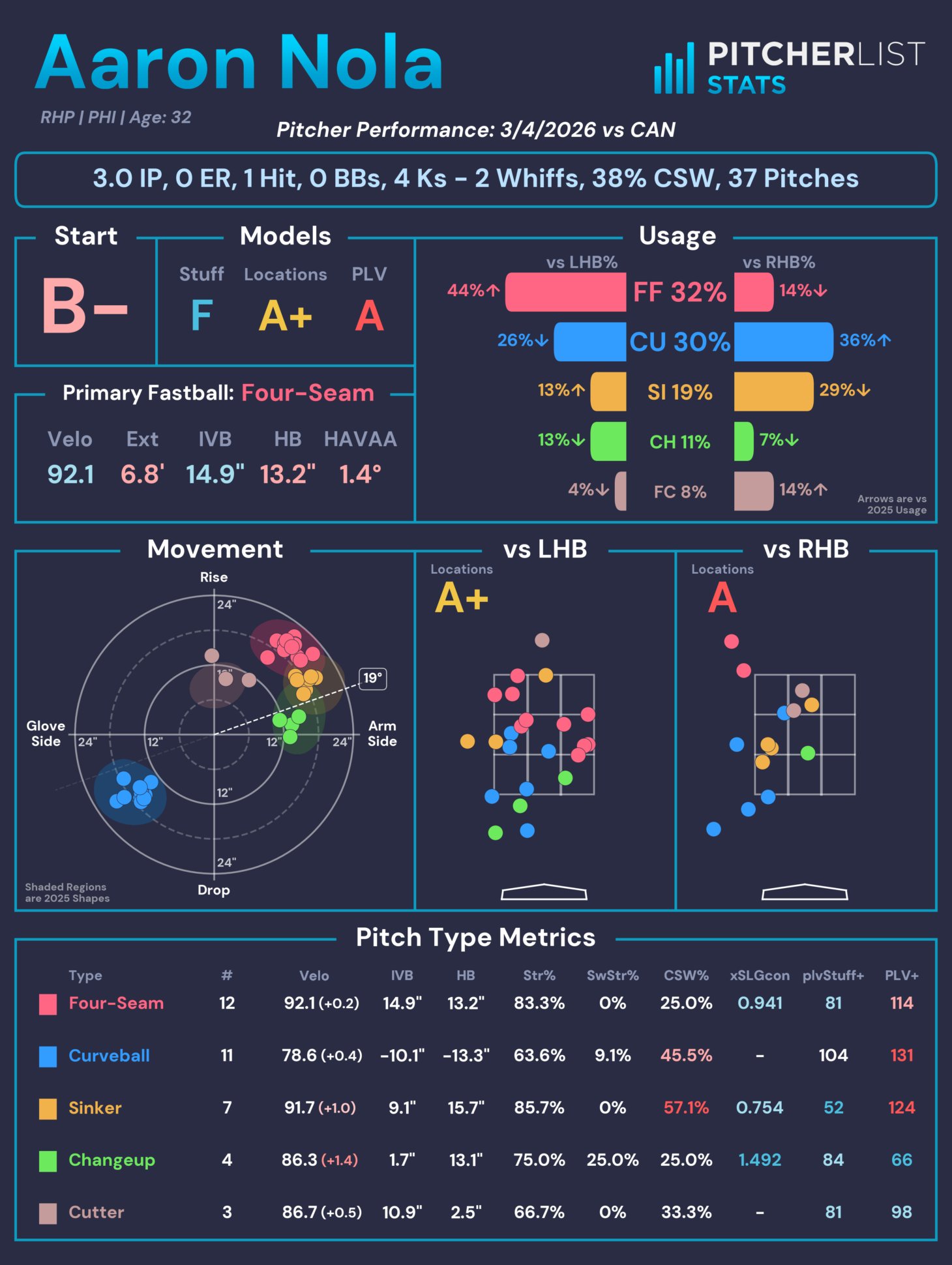 Nola is reportedly healthy and is currently pitching for Team Italy in the WBC. His most recent outing saw three scoreless innings against Team Canada with the same elite command he’s boasted throughout his career.