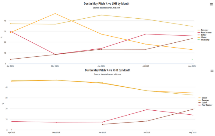 Dustin May pitch usage by handedness and month, 2025 (Statcast)