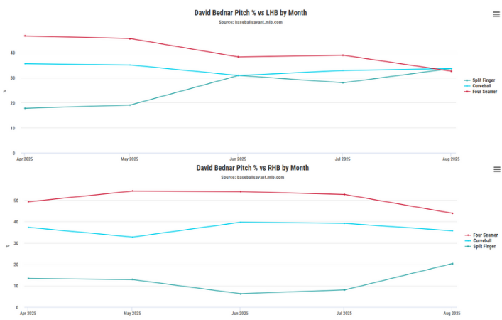 David Bednar pitch usage by handedness and month, 2025 (Statcast)