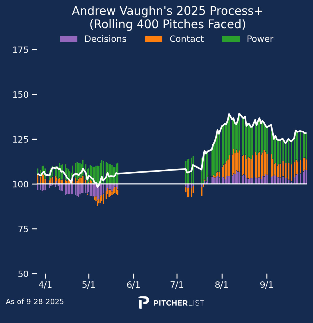 According to Hitter Ability data, Vaughn posted a 102 decision value, 107 contact ability, and 112 power. He also posted a 116 mark in gap power and a 107 mark in HR power. Thus, it’s not a surprise that he had a 120 Process+ in 2025, which was better than players like Brent Rooker and Taylor Ward, who had 119 Process+ marks.