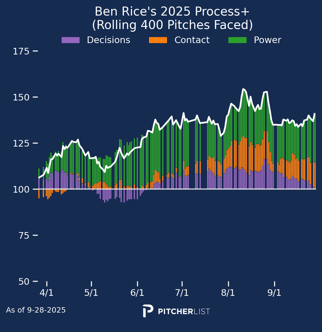When it comes to his skills within his Process+ rolling chart data, Rice succeeds with exceptional power (124) and strong contact (116). His decision value ranks the lowest of the three (110), but it showed positive trends for the most part last year, except for a stretch in May. That can be seen in his Process+ rolling chart data below.
