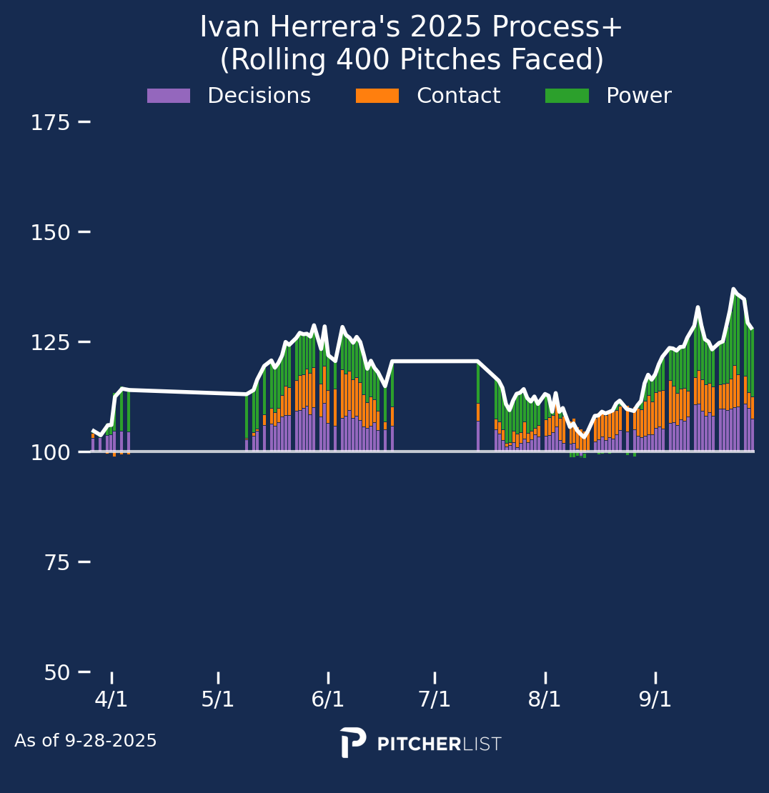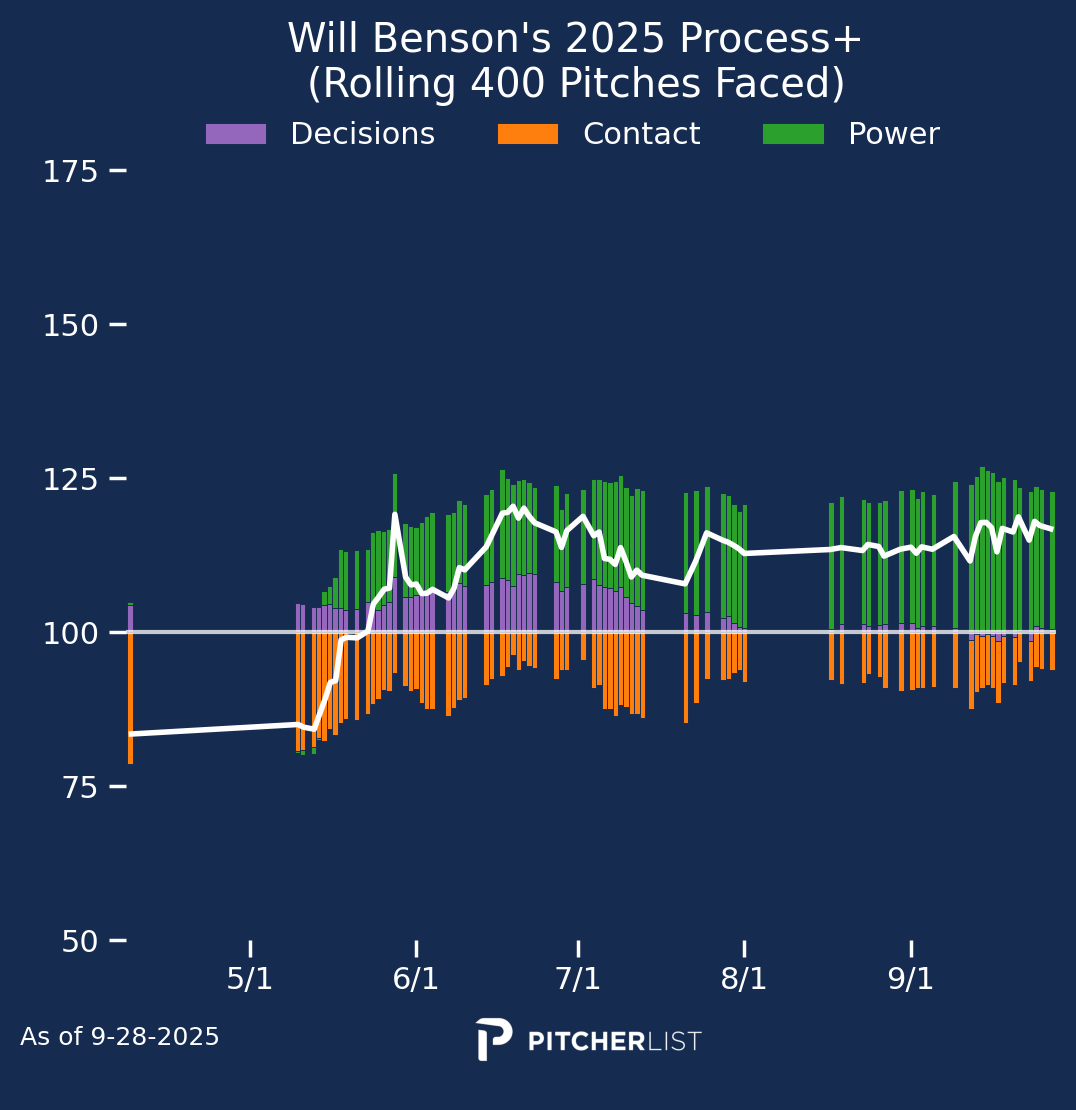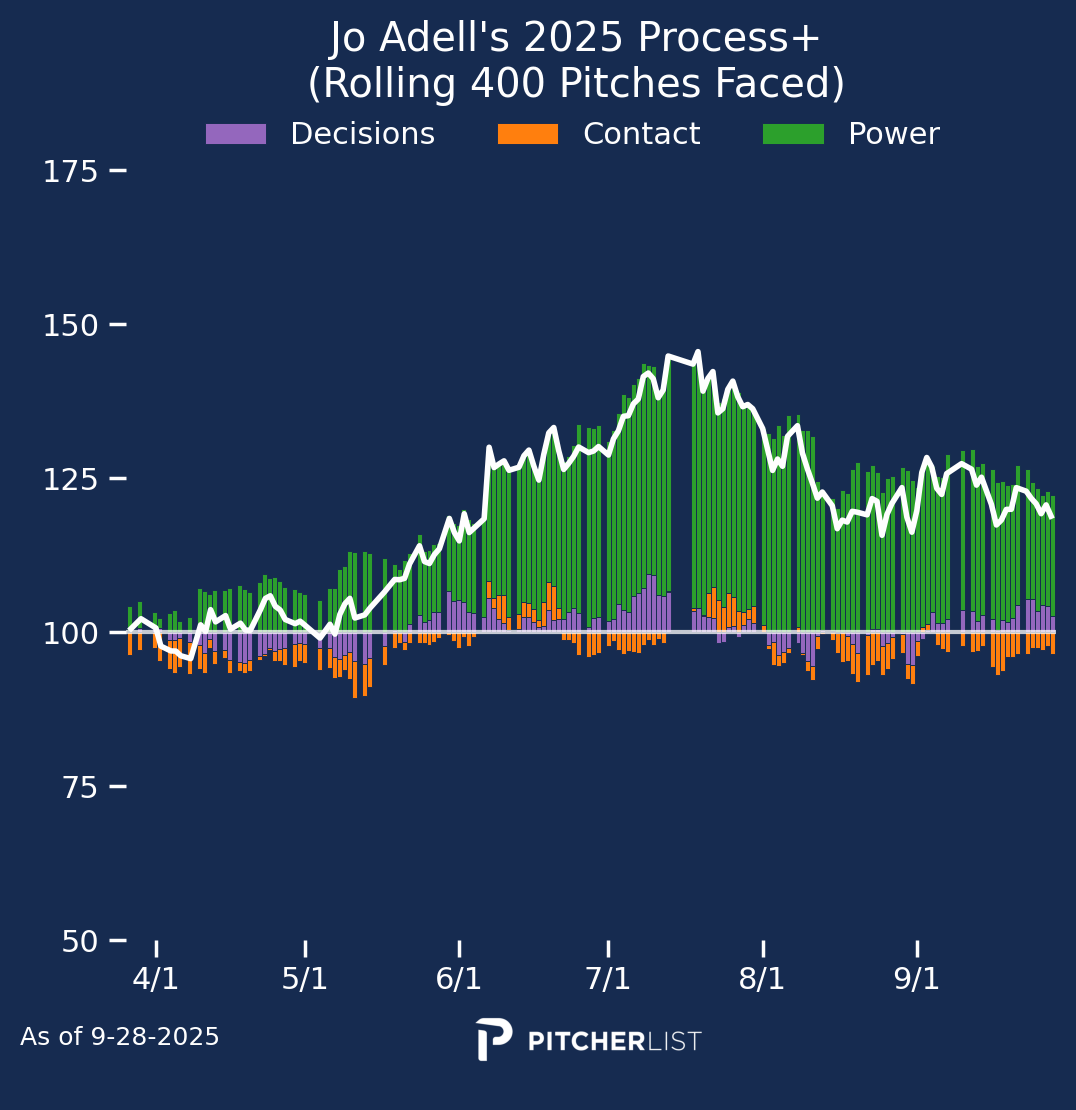 In addition to his 123 Process+, he posted a 112 decision value, a 109 contact, and 112 power. When looking at his Process+ rolling chart from last season, the 25-year-old remained above league average in all three categories throughout the season, with his power and contact ranking as his best categories.