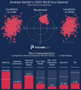 Another arm who could take a significant step forward with the right adjustments is Andrew Painter. Beyond sharpening his approach against left-handed hitters, much of his developmental focus is likely on refining his fastball. It sounds strange to question a pitch that averages 97 mph, but the results tell the story: it allowed the highest wOBA in his arsenal, generated the lowest whiff rate, and Pitch Level Value (PLV) graded it as the weakest offering in his five-pitch mix.