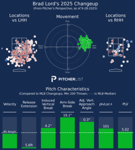 Brad Lord exemplifies this trend. He increased his changeup velocity and boosted its spin by 11%, which helped drive the pitch’s horizontal break up to 19 inches. Even with these improvements, the changeup isn’t his defining weapon—but it now functions more effectively as a supporting pitch alongside his superior gyro slider and curveball. He trusts it enough to use it frequently in two-strike counts, even though he can struggle to land it in the zone.