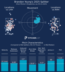 There are six rookies with splitter data at Triple-A and MLB in 2024-25. The splitter was thrown on average much more frequently and with less spin, as is ideal, and at a slower rate. Someone who stood out for their improvements in measurements and usage was Baltimore’s Brandon Young.