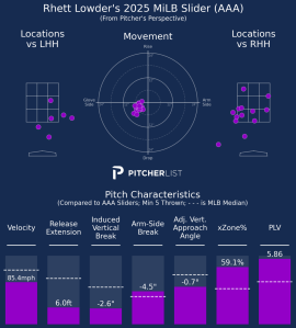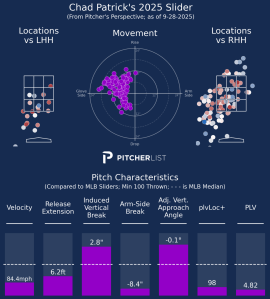 Patrick did add more extension, along with a few extra inches of both vertical drop and horizontal sweep. Interestingly, he delivered the pitch from a higher arm angle while maintaining the same vertical release point—likely because of that added extension. While the slider isn’t his primary weapon, it produced a stronger whiff rate in Triple-A and carried a more favorable PLV grade there. In the majors, he appears to lean on it as a putaway option vs. righties.