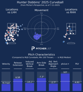 What changed was the effectiveness. Dobbins transformed his curveball from a serviceable pitch into a 38% whiff-rate weapon. His arm angle ticked up, yet his release point stayed low thanks to a 3.4% boost in extension. He also added a bit of spin and velocity, helping the pitch play up even more. The curveball quickly became his best putaway option, slightly edging out his slider, and he trusted it enough to make it his most-used pitch with two strikes.