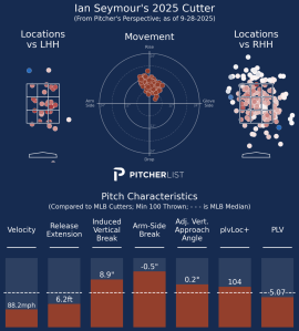 A strong example is Ian Seymour, who added roughly two mph to his cutter—an important development given that he typically operates below 92 mph overall. Despite that modest velocity band, Seymour consistently generated whiffs, and the data hints at an arsenal that could benefit from further “collapse”—bringing his pitch shapes and release points closer together to enhance deception.