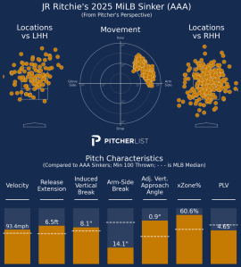 Even so, the sinker remains his least effective pitch despite being his primary one. If it’s going to anchor his approach as a groundball weapon, it has to take a step forward. He may not be able to squeeze out more movement, but a slight velocity bump could give it sharper depth and improve its effectiveness against major-league hitters. If he can turn that pitch from a liability into a dependable foundation, the leap to Atlanta becomes much more realistic.