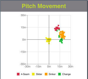 Still, there’s room for refinement—particularly with his most-used pitch, the sinker. The two-seamer averages 93 mph with roughly a 2200 RPM spin rate and a solid 6.5 feet of extension. It generates an impressive 14 inches of horizontal movement but only about 9 inches of vertical break. Given his already low arm slot, there may not be much room to chase additional vertical movement by dropping lower. Interestingly, his pitch movement chart shows two distinct clusters, suggesting he may have already made a meaningful tweak to the offering.
