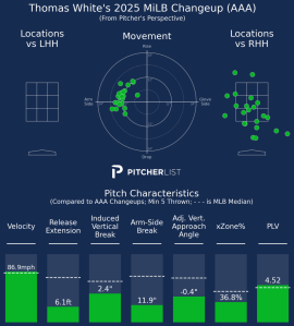The fastball is the next frontier. A modest velocity bump, a bit more induced vertical break, or improved extension—similar to the gains we saw from several 2025 debuts—could elevate his profile across the board. Even without touching 97 mph, simply reducing some horizontal movement to improve command and predictability might unlock better results. The encouraging part? White already owns three pitches with whiff rates north of 35%. With either enhanced stuff or improved command, he has the ingredients to make a substantial leap.