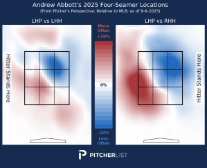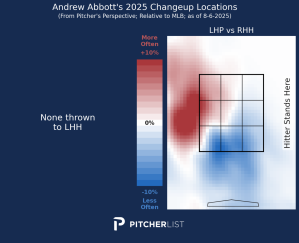This should not inspire confidence in Abbott being able to maintain his performance. A pitcher who isn’t getting strikeouts while having extreme fly ball rates is usually not doing well. Especially not with Cincinnati as his home park, which generally makes it exponentially worse. Thankfully, these negatives are somewhat mitigated by Abbott’s technique this year. His secret is that he’s filling the outer half of the zone against all hitters to make it harder for hitters to pull the ball. Abbott leads all qualified pitchers with a 31.0% opposite-field contact rate this season. While he does still allow more pulled contact in the air than you might like, this is the nature of who he is as a pitcher. He will always allow a lot of flyballs. Getting them to pull as few of those fly balls as he can, or making it so that pulling the ball means hitting it less optimally, is how he can manage this.