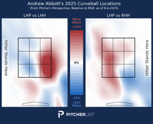 What Abbott’s changeup lacks in pure stuff, it makes up for with deception. It spins on a similar axis as his 4-seam with the same spin efficiency and with higher than average spin for a changeup. He also maintains his delivery better than most pitchers across their fastballs and changeups; he doesn’t drop his arm slot much at all to throw this pitch. So while it doesn’t hit any elite marks for shape or separation, its 6” of horizontal and IVB difference from the 4-seam and 8 mph gap are more than enough when paired with its trickery.