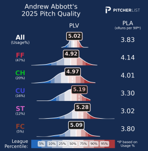 A picture is painted of a pitcher who should be a bit above average. That is not what Abbott has been this year. PLV accounts for command as well, which we’ll get into a bit later. First, let’s dig into what he throws to get a better idea of what he’s working with.