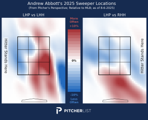 Here, we see more sweepers thrown to the outer half to same-handed hitters, where they belong. Interestingly, he throws this pitch below the zone against righties instead of the curveball. Logic would dictate that he should throw the pitch that moves down more below the zone, and the pitch that slightly fights gravity at the bottom, for more chases and called strikes, respectively. I would assume the reason he doesn’t is that the sweeper is easier to get under than the curve is, and would thus be more open to dangerous contact when left down in the zone, even if he were spotting it where he was throwing the curve.
