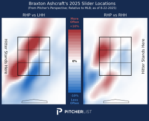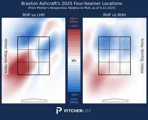 I mentioned earlier that Ashcraft earned a 108 plvLoc+ for his slider. Unfortunately, that’s the only pitch he’s locating well. He has displayed a knack for drilling the low glove-side quadrant and areas off of it with his slider. These locations are why this pitch has a 98th percentile swing rate and 94th percentile chase rate. The way he uses this pitch forces hitters to act. When they do, they have to hope he missed high or to the right of his spot; they aren’t doing anything with it otherwise. The issue with throwing so many of these in the zone is that they’re much easier to make contact with, as you would expect. This diminishes his strikeout potential, though it does potentially allow him to pitch more efficiently.