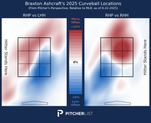 Ashcraft’s fastball locations have been kind of odd. He heavily favors throwing it low and glove-side, presumably to set up sliders there. Beyond that, it’s hard to make out what his plan with it is. He elevates it sometimes, it’s in the zone a bit more than average, and he leaves it down the middle a bit too much. It’s not unheard of, but his slider command being this superior to his 4-seam command is a bit strange. Progressing this skill is a big thing to watch for him; the ability to avoid bad spots with this pitch would cut back on a lot of the potential trouble he could get himself into on the mound.