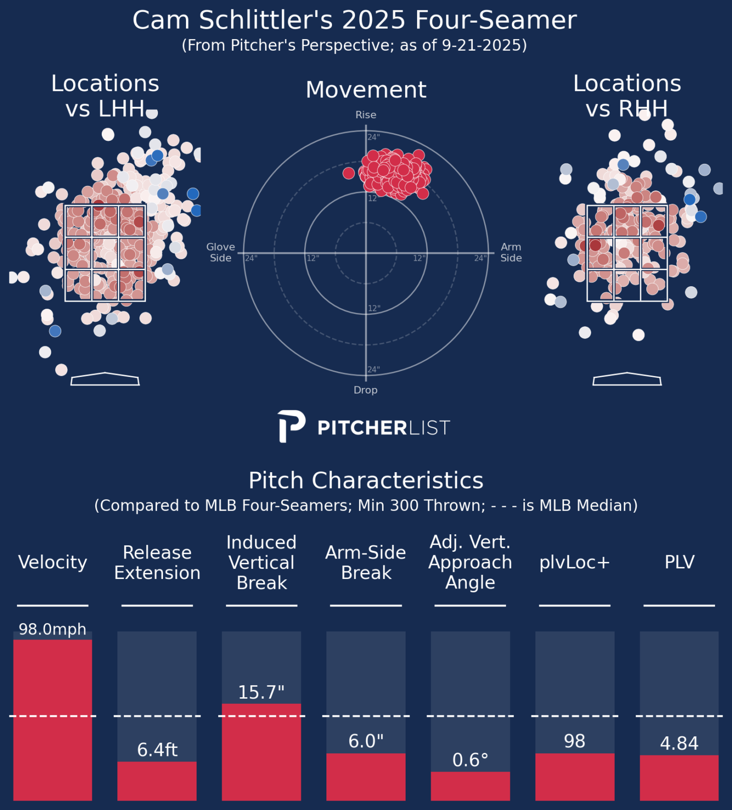 The big neutralizer, however, has been his four-seam. After averaging ~93 in the minors in 2024 and adding two ticks in 2024, Schlittler has sat 98 in the Majors, getting all the way up to 100.6 mph in an August start vs. the Mariners. This velocity development is far from common and likely a product of intentional development by Schlittler to fill out his 6’6 frame.