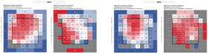 The heat maps above depict the areas of the zone where Witt produces damage (ISO), has been pitched (Pitch%), and frequently swings (Swing%) against opposing pitches over the past two seasons. Most of the hard contact that Witt produces comes against pitches located low-and-in, and it is apparent that Witt is actively seeking to produce damage on these pitches, as he frequently swings at pitches located on the inner third of the plate. Pitchers have taken notice of his relative passivity on the outer third of the plate, as pitchers tend to throw more pitches in this area of the strike zone, as they are confident in their ability to either generate called strikes or minimize his offensive production with these pitches when facing Witt.