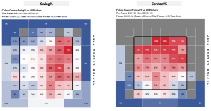 The heat maps above depict Cowser’s swing and contact tendencies against breaking balls during the 2025 season. As shown by the heat map on the left, Cowser has been very passive regarding swinging at breaking balls located on the outer-third of the plate, mostly swinging at breaking balls that are located on the inner-third. While Cowser has likely adopted this approach because he believes that most of his damage against these pitches occur when they are located on the inner-third, taking too many pitches in the strike zone can allow the pitcher to easily get ahead in the count, placing the hitter in a more defensive count state where they are more likely to swing-and-miss at pitches out of the zone. As shown by the contact rate heat map, Cowser has experienced difficulty making contact with breaking balls located underneath the strike zone, leaving Cowser vulnerable when pitchers attempt to induce a swing out of the zone in two-strike counts.