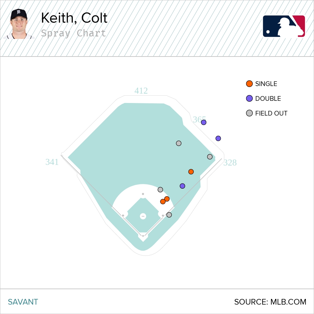 As for the plate discipline, the decrease in chase rate doesn’t exactly come with any additional benefits. He’s still whiffing around the same amount, which means it’s coming on pitches in the zone. Keith’s 84.5% zone-contact rate is around league average, 2.8% down from last year. Over 50% of the pitches Keith has seen have been in the zone – pitchers aren’t trying to tempt him outside. Instead, he’s getting tons of opportunities to make swings count.