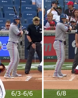 This looks similar to what he displayed from 6/3-6/6, but the knees are slightly more bent and the bat is less vertical. All in all, it looks to be the midpoint of everything we’ve seen this season.