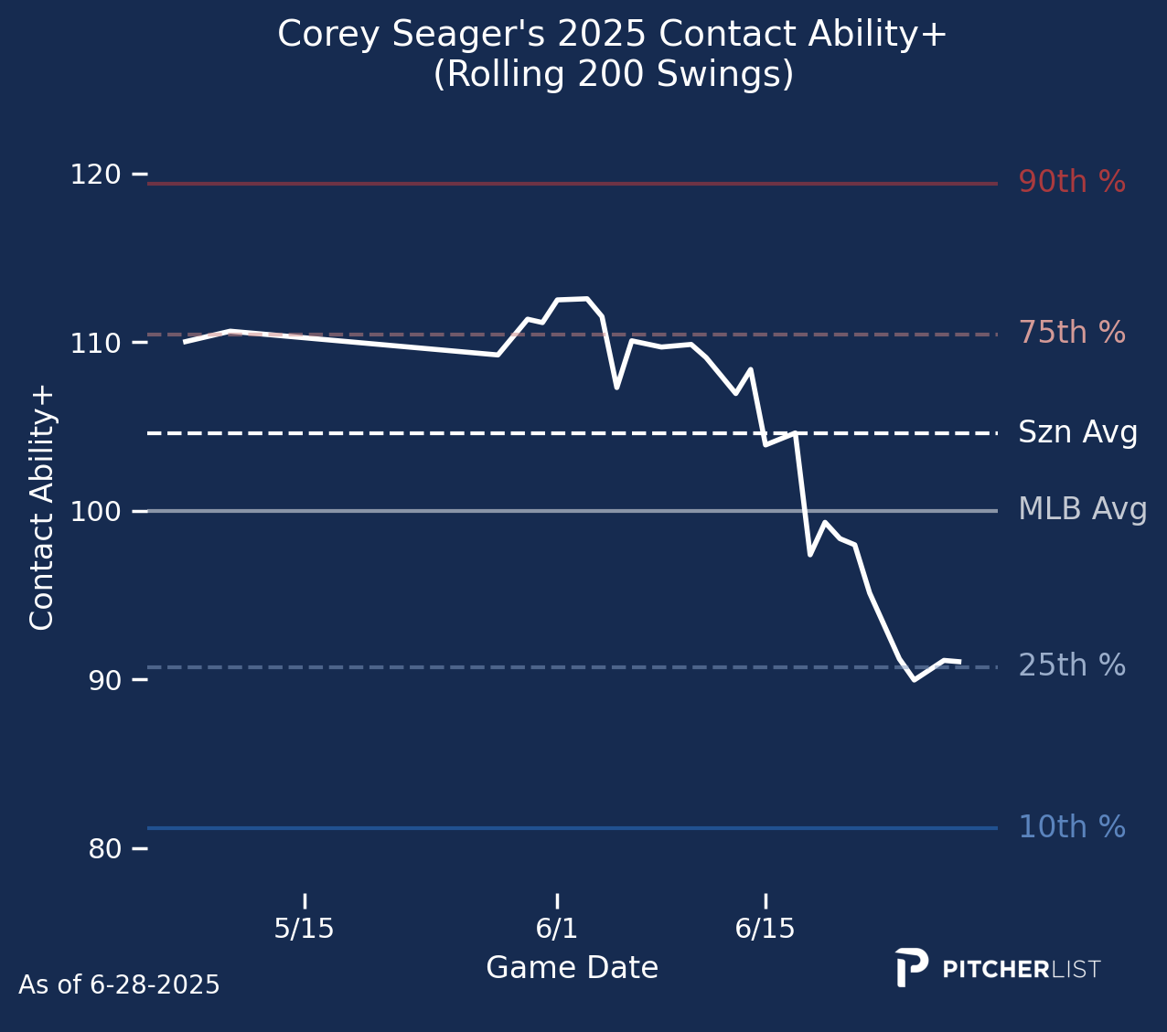 As for the batted ball quality, there’s little worry. Seager has a .536 xSLG, which is equal to his career figure. The 14.4% barrel rate is a tick below his last two seasons, but still above his career rate of 11.2% and is in the 88th percentile among all hitters.