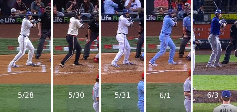 On May 30th and 31st, Seager opted for an aggressive inward turn of that front foot and then a similar, but subdued version. He was all over the place with his open stance in the four games at home after returning, but returned to his original stance against Tampa Bay on June 3rd.
