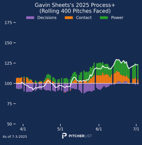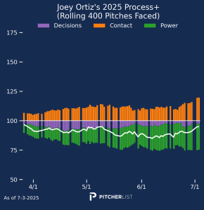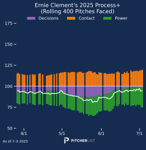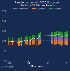 Now that’s a process chart I like to see. Laureano made clear gains in decision quality and power output before his injury in May and has maintained that level of production since he returned to action. He does have team options in ’26 and ’27, but the Orioles are well out of contention and in need of pitchers, so Laureano could be a deadline trade candidate. If he does get dealt, it would also certainly improve his offensive context. If you have a need in your outfield, I strongly recommend checking in on Laureano while people seem to be overlooking him.