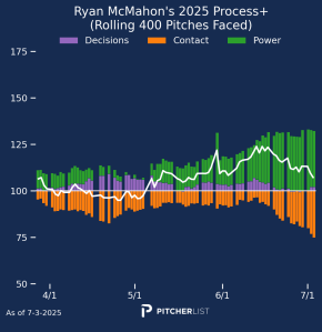 McMahon is on pace to produce his sixth consecutive 20 homer season (not counting 2020 because we never count 2020). But he is also carrying his lowest average and OPS since his rookie year way back in 2018. Like Sheets, McMahon had a huge May, slashing .289/.389/.500 with four homers. In fact, he carried that hot bat with him for most of June, belting six homers over the first three weeks of the month. He also had a .349 BABIP in May and a .320 BABIP in June.