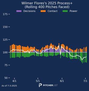 Unlike the two guys we looked at already this week, Wilmer’s process chart does not show signs that he’s coming out of a slump. To the contrary, he’s been trending downward since the start of June. I just don’t see any reason to expect a turnaround here, and the Giants would do well to get Devers up to speed at first base, or hit the trade market again.