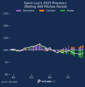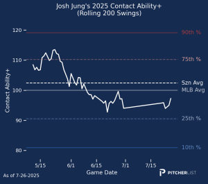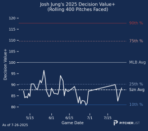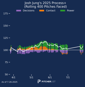 Well, dang. I really like Jung and want this to be a legitimate breakout, (I’m heavily invested) but I just do not see it. Not only are both his contact ability and decision value graphs both still below average for MLB hitters, they are both worse looking now than back in June when Jung was batting in the .150s. He’s also still slotted into the bottom third of the order in five of the seven games since his return, for a team with a bottom 10 offense. Sigh.