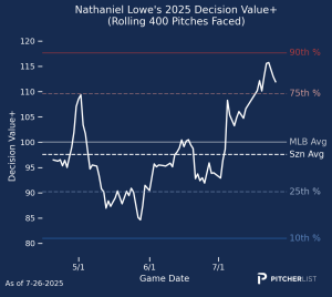Sadly, Lowe has turned in the worst offensive performance of his career. He is slashing .226/.295/.388 and has been even worse in July, with a .200/.281/.350 line this month. Oddly, Lowe’s barrel rate, hard hit rate and exit velocity are all slightly better this year than they were in 2024. All three metrics are below the MLB average, but obviously that was the case last year as well. On the other hand, his chase rate, whiff rate and K rate are all worse than last season. His K rate is especially concerning, as it has ballooned from 22% to 27% and now sits firmly in the bottom 20% of the league.