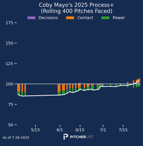 Mayo’s exit velocity is little underwhelming at 88.8 MPH, but his 10.8% barrel rate and 43.8% hard hit portend great things to come. His chase and whiff rates are higher than we’d like at 29.3% and 27.4% respectively, but his overall K rate is nothing to be scared about at just over 20%, and trending better. His process chart, though a smallish sample, is also looking better lately. Look at that line go, just barely starting to get itself above that MLB average.