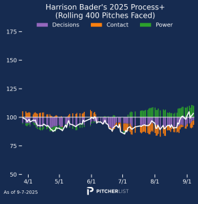 I also like what I see on this chart. Bader isn’t a big slugger, but he’s got those green power bars up above that MLB average line since the start of July, and everything is pointing upwards lately. I’m going to give Bader a strong add recommendation, just be aware that someone might try to grab him out of your hands and scream at you until you relent. Don’t give in, unless of course, you’re on the Jumbotron.
