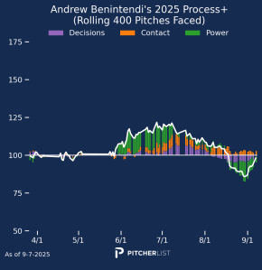 His process chart does a good job of illustrating his strong power metrics and good decision value. His contact chart does an even better job of illustrating his struggles with making contact. The good news is that his contact ability does appear to be on the upswing, even though he’s batted just .160 so far in September. I am honestly tempted to read way too much into that upward bend at the end of his contact chart. What if he’s figuring it out and is about to get hot at the hot perfect time?