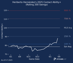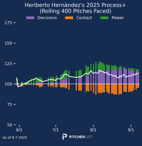 Heriberto was called up right at the end of May and promptly set the league ablaze with a .933 OPS through 57 plate appearances in June. He fell off a bit in July with an .853 OPS over 51 plate appearances and fell even further in August with a .642 OPS. Hernandez has a strong barrel rate over 10%, a solid hard-hit rate over 43%, and an alright exit velocity just under 90 MPH. He walks enough and is good at laying off pitches out of the zone, but his 36% whiff rate is a big problem that has contributed to a strikeout rate over 27%.