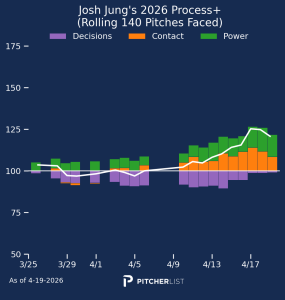 Jung looks much better under the hood than he did a few weeks ago, too. His 55.4% hard hit rate is in the league’s top 10% and his exit velocity has jumped all the way to 91.1 MPH, good enough to join the top quartile. He’s chasing and whiffing less and has dropped his K rate under 19% too. Take a gander at the upward trend in his process plus chart. ( I did warn you we were heading into chart season).
