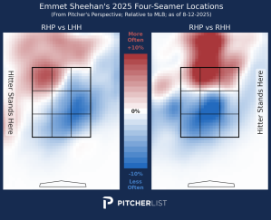 Oftentimes, when a pitcher returns from a long absence, they tend to struggle with some aspects of the game. Be it their command or their stuff not bouncing back, there’s a reason we tend to wait for a pitcher to prove they’re back to normal before deciding they’re 100% again. Sheehan, however, is showing very few signs of all the time he missed. He started his rehab assignment this year, one day shy of 20 months since throwing his last pitch in a competitive game. Maybe the Dodgers’ having him ramp up for more than a month had something to do with the way he’s come back so strong. A quick fun note, he had a start with 6 perfect innings and 13 strikeouts on 73 pitches in AAA toward the end of it. Back on topic, Sheehan’s command doesn’t look any worse for wear; you could even argue he’s executing his game plan better than he was the last time we saw him.