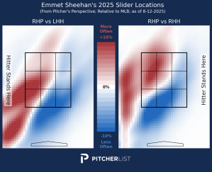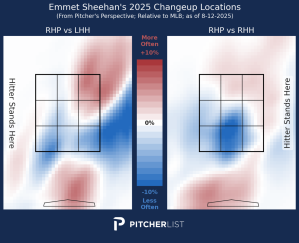 Sheehan’s fastball lives at the top and above the zone, as it should. This is underselling just how consistently he’s been throwing it high, though. His 73.3% hiLoc% is 2nd only to George Kirby among pitchers who have thrown as many fastballs as Sheehan has in his abbreviated season to this point.