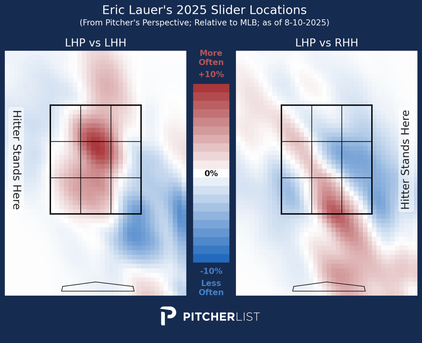 The slider has a gyro shape that Lauer deploys primarily in two-strike counts to righties and as a strike pitch to lefties. It has the same amount of horizontal break as the cutter, making it an optimal tunneling pitch.