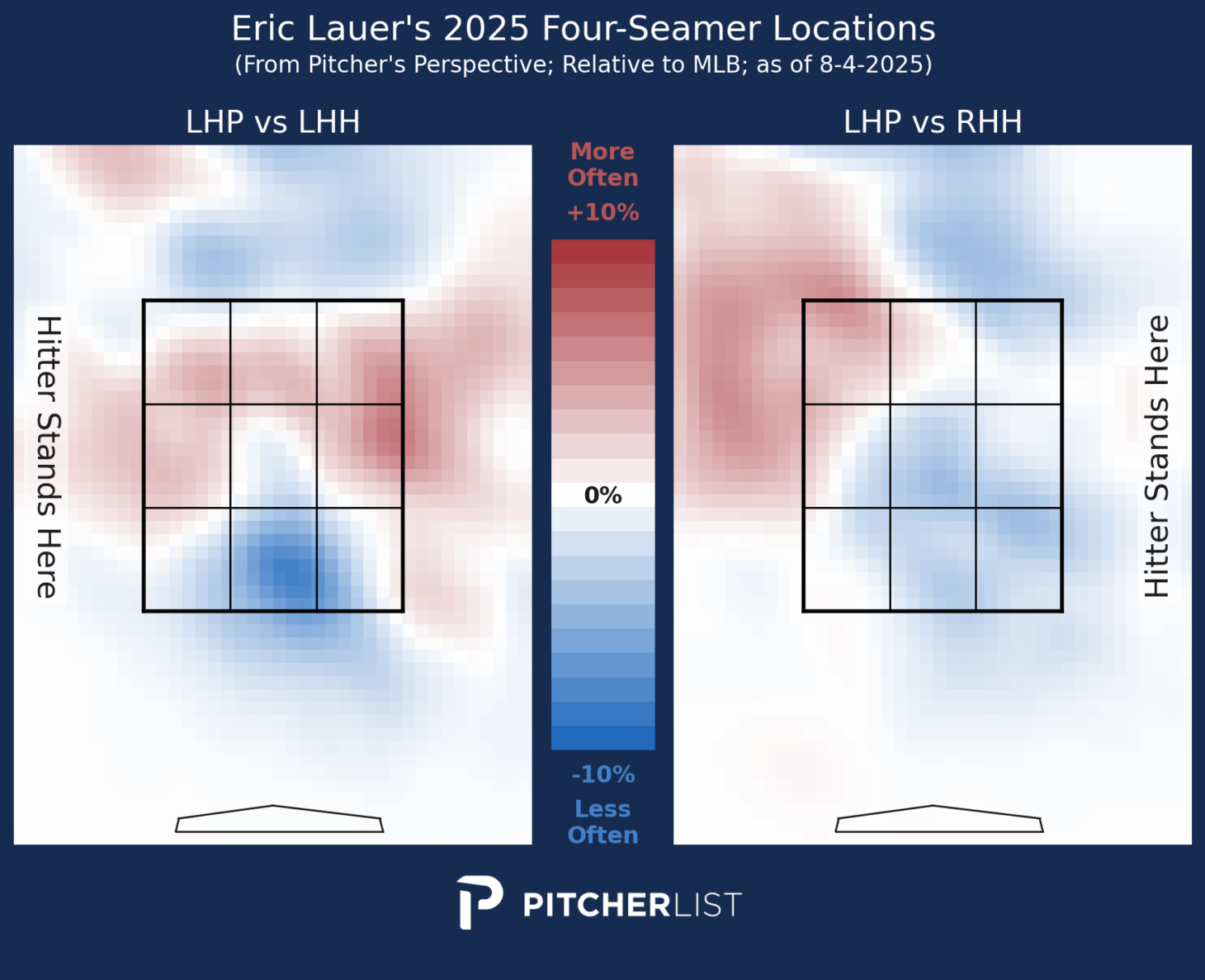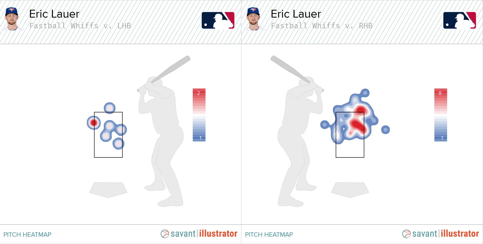 While it’s not frequently a 2-strike pitch, Lauer can deploy it sparingly to lefties to get a strikeout. It has a 50% putaway rate on eight pitches thrown in 2-strike counts.