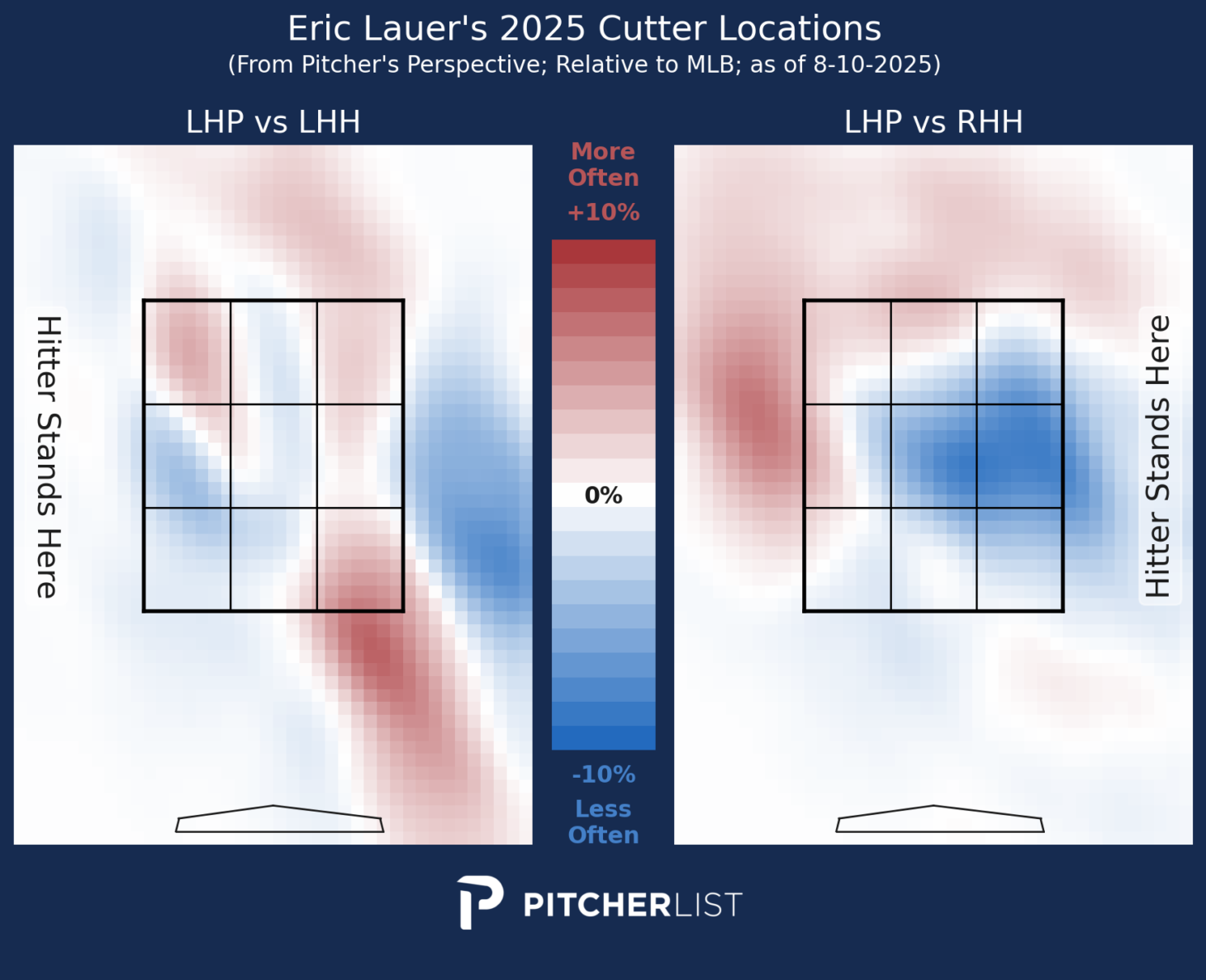 Lauer’s cutter is his main secondary pitch to all hitters, which he throws at 86.5 mph. With the lower velocity, there’s a decent amount of drop to the pitch. He gets an extra inch of cut against righties compared to lefties, which is likely due to location.
