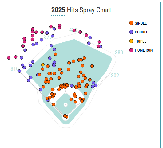 Home runs dipped, meaning power decreased, while batting average rose, meaning contact improved. The stolen bases took an unrealistic jump, adding 24 more than the year before. Don’t get me wrong, I would love for my first basemen to steal 30 bags a year, but I’m taking the chance that he won’t be able to do this again and that, from a base running standpoint, he’s being drafted at his absolute ceiling. And I’m not trying to be picky, but his groundball rate rose to a 39%, confirming a now three-year increase trend. With the park that he plays in, it worries me for his 2026 outlook. I see there being better value in the middle of the 6th, where he’s being drafted.