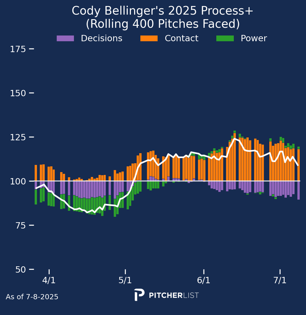 The approach has been solid, too, so this isn’t just a power surge. A 14.4% strikeout rate is a career-low for Bellinger and is backed by a career-low 8.3% swinging strike rate and a career-high 82.9% contact rate. The decision value is a bit lacking, but his Contact+ and Power+ are both surging with his new approach.