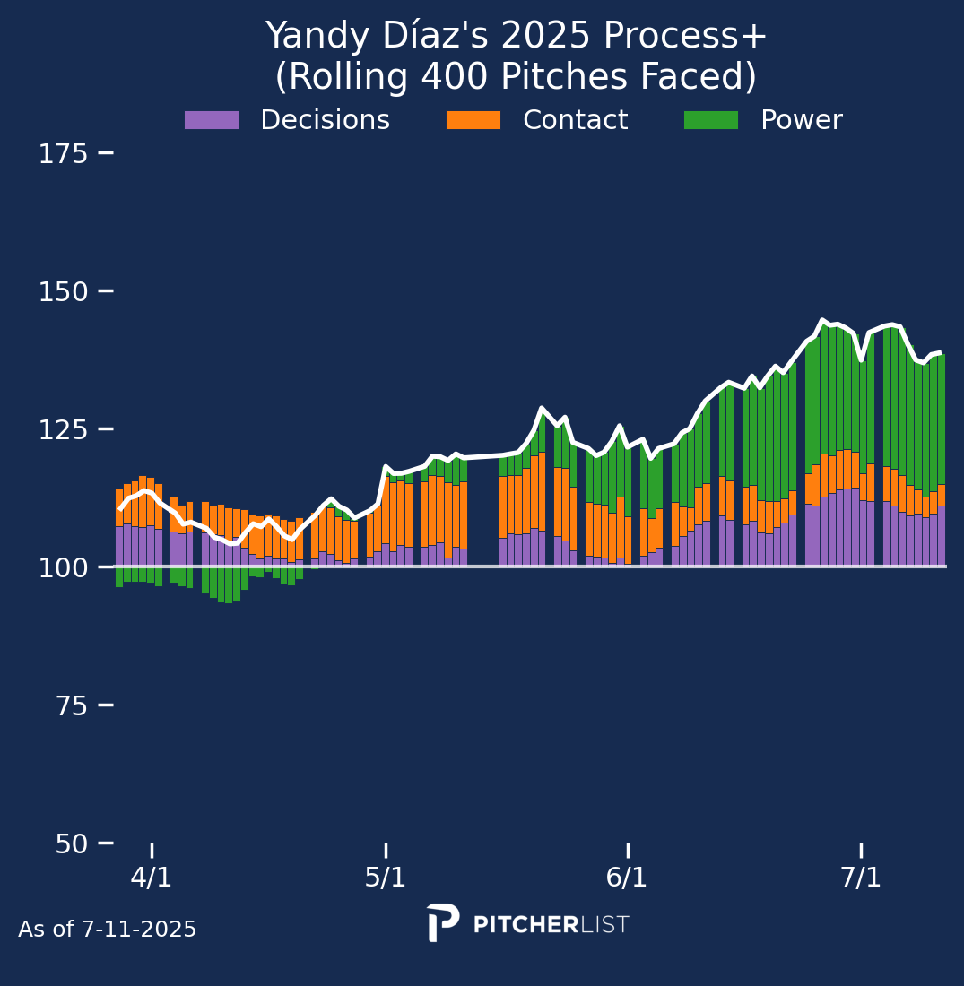 Díaz has flown under the radar this season as a Top 50 asset, ranking 50th in wRC+ and 19th in Process+ so far this season. While his newfound average exit velocity and 113 Power+ have certainly played a big part in this step forward, he backs it up with a 109 Contact+ and 110 Decision Value+.