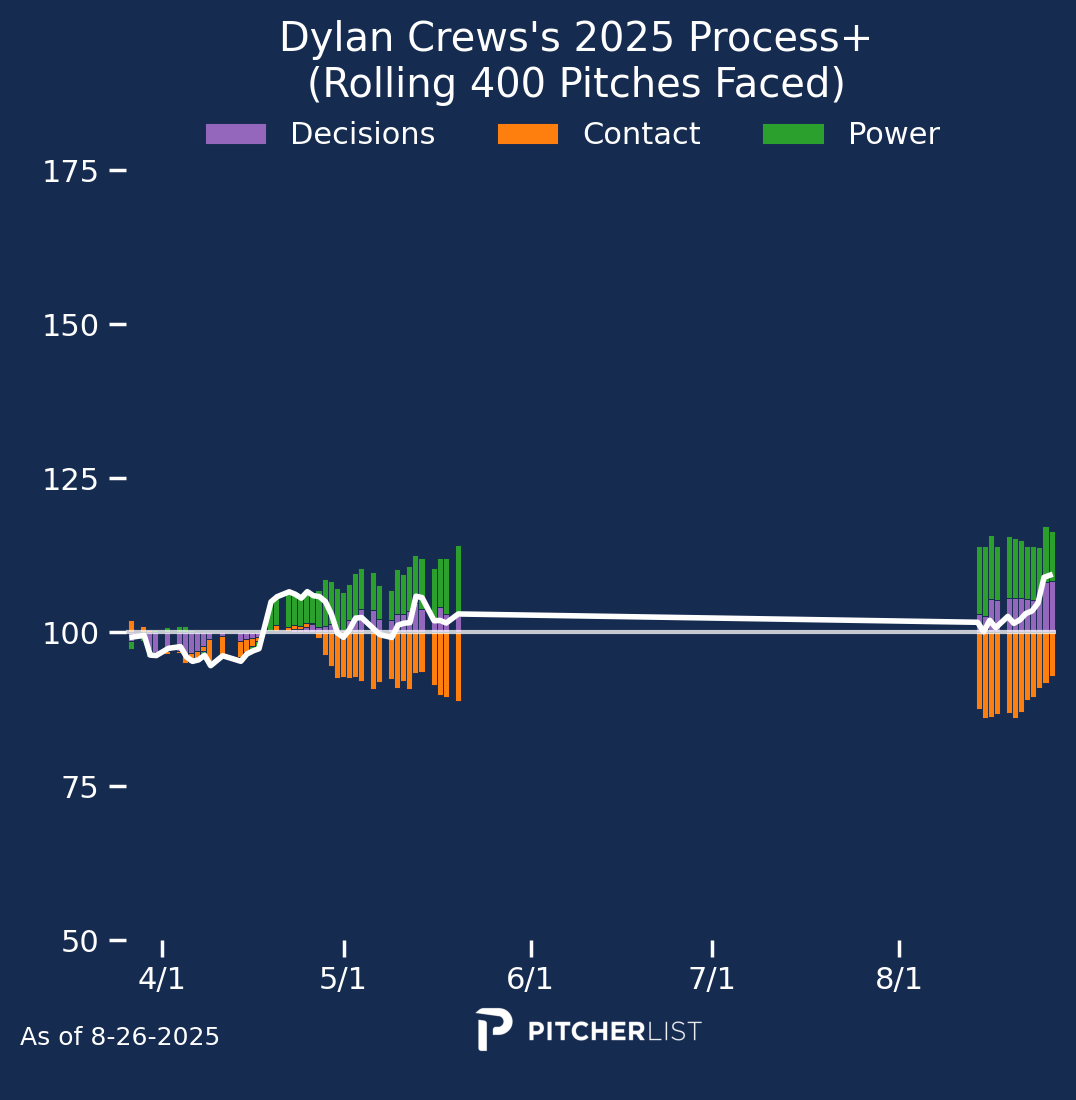 While Dylan Crews is hardly matching his 2024 output this season, his performance has improved since returning from an oblique strain in May. Since coming off the IL two weeks ago, Crews now has three steals, 4 RBI, and 9 runs while going 11-for-48. Modest production for a 23-year-old, but a quick look under the hood shows there are signs for optimism. The engine is running well with a 29.2 ft/s sprint speed, placing Crews in the 92nd percentile.