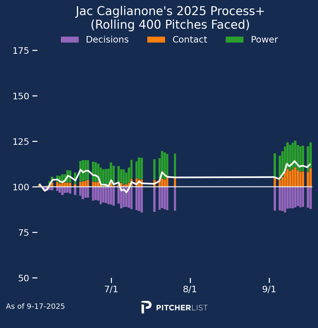 Atlanta’s second-half surge has been too little, too late to push for a spot in the postseason. Nobody told Drake Baldwin, however, as he notched his 17th home run of 2025 in a 10-1 blowout of the Detroit Tigers. Baldwin has emerged as a Top 10 catcher this year and the frontrunner for the NL ROY award. Baldwin’s power is his carrying tool with a 91.7 mph average exit velocity, 10.6% barrel rate, and 50.0% hard hit rate. However, his 106 Power+ has been outpaced by a 110 Contact+ and 121 zDV+, which bodes well for his longevity as an elite catcher going forward.