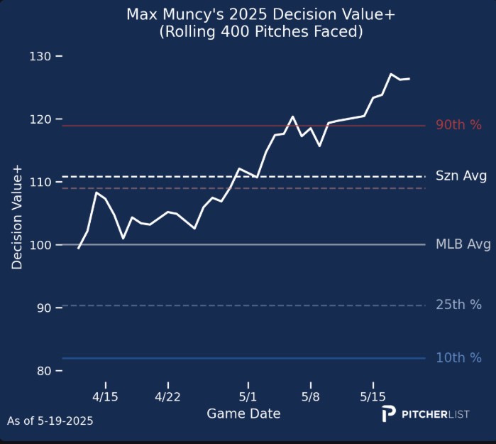“He can’t see without his glasses!” Take a look at the chart below on Muncy’s swing-decision metrics and see if you can spot where he got his new frames. After a rough start where he batted .095 to start the season, Muncy has bounced back when he started wearing glasses that corrected some astigmatism in his right eye. The results speak for themselves, and he’s getting on base 36% of the time this month. He’s still struggling against lefties, but he’s lifting up all his metrics over the last few weeks, and last night’s performance (including the game-winning sac fly) continues the trend.